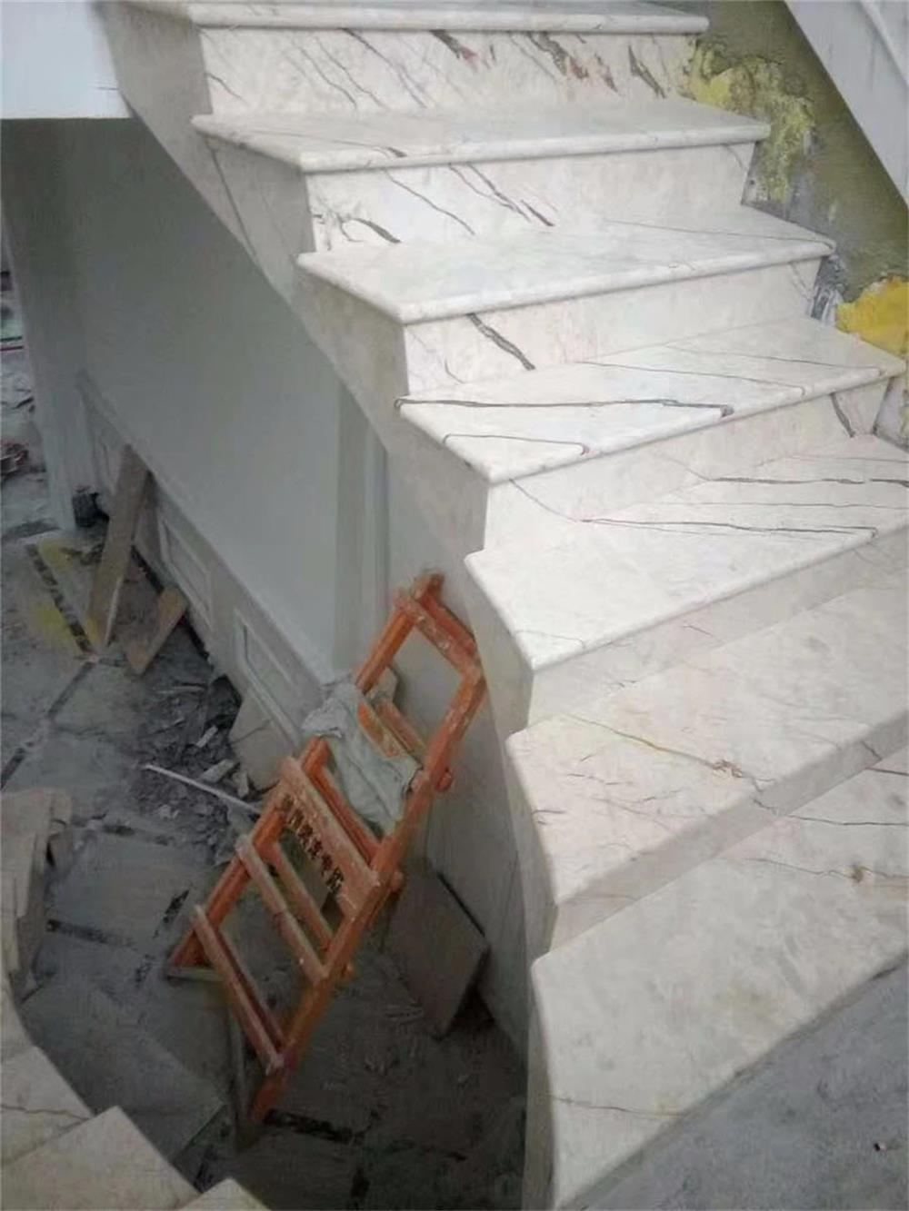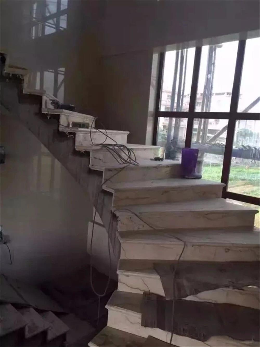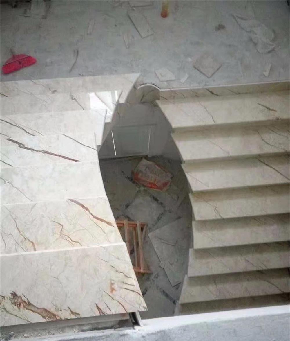 大理石旋转楼梯部件高精度安装难度大的是旋转扶手,其次是旋转腰线,之后是旋转盖板,旋转侧板,踏步。因为大理石扶手是悬空对接,对接后的延长线很容易产生偏差,所以对接安装扶手要选用经过培训的高级技师安装。