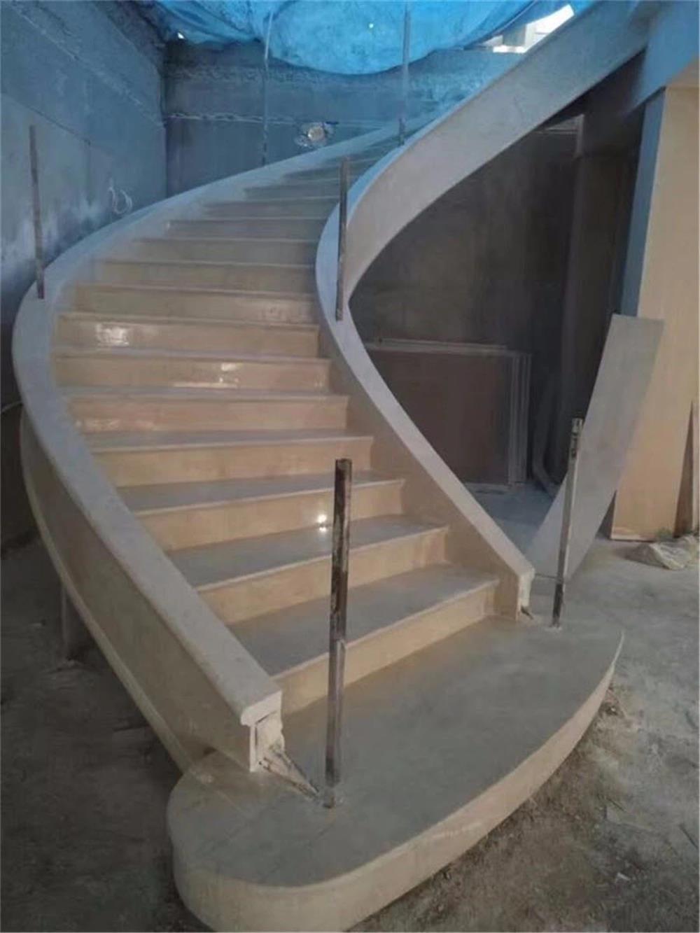 旋转楼梯的基础框架不论是用混凝土或钢架制做都一定要精准,石材贴面的曲线弧度要自然,不能有曲度的突然变化,一个好的石材旋转楼梯要给人一个整块石料制做的感觉,不能有枯树枝、藕节的感觉。